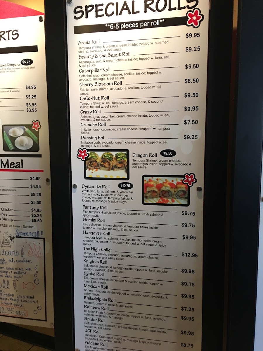 Shrimp tempura inside, topped with imitation crab, avocado, and spicy mayonnaise. 6 to 8 pieces per roll.